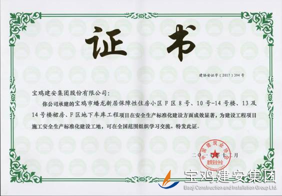 2017年11月23日,從中國建筑業(yè)協(xié)會建筑安全分會獲悉,由我公司八項目部承建的寶雞市蟠龍新居保障性住房小區(qū)F區(qū)8號、10號—14號樓、13及14號樓裙房、F區(qū)地下車庫工程在安全生產(chǎn)標(biāo)準(zhǔn)化建設(shè)方面成效顯著,被評選為建設(shè)工程項目施工安全生產(chǎn)標(biāo)準(zhǔn)化工地,可在全國范圍內(nèi)組織學(xué)習(xí)交流。這是繼2016年后我公司第二次榮獲此殊榮。我公司連續(xù)兩年獲此榮譽,為進一步提高我公司在建筑行業(yè)的影響力,提升企業(yè)形象,促進企業(yè)長遠發(fā)展奠定了一定的品牌基礎(chǔ)。
