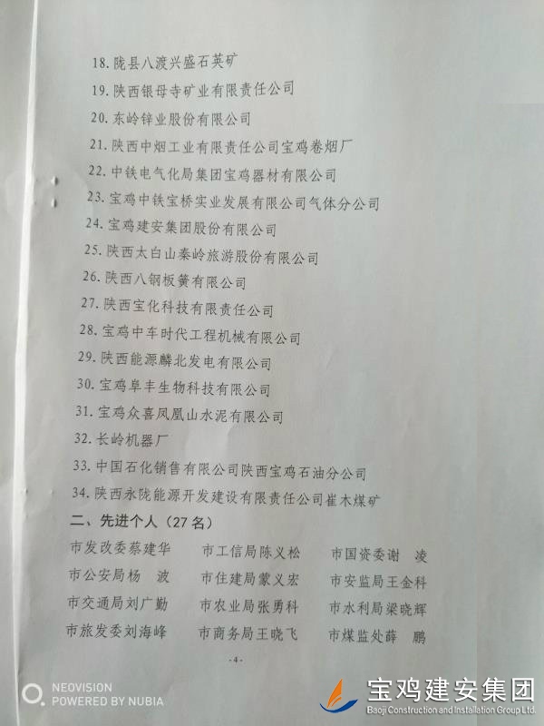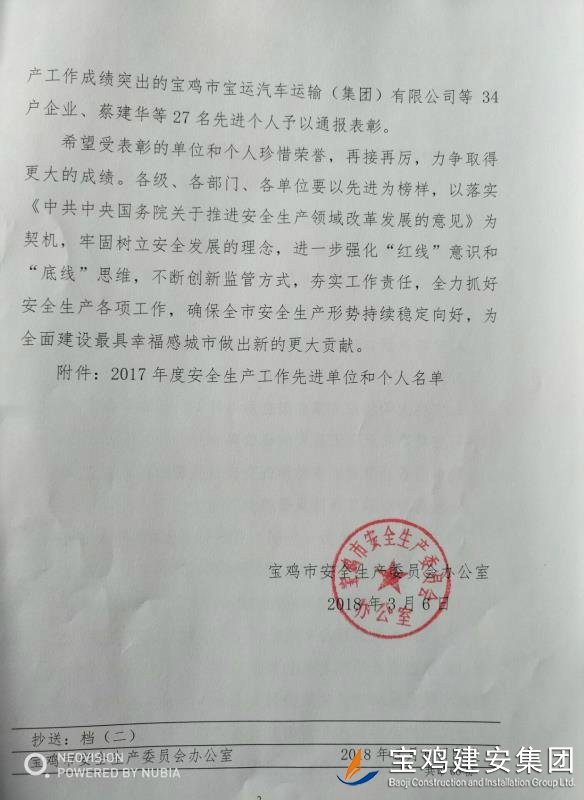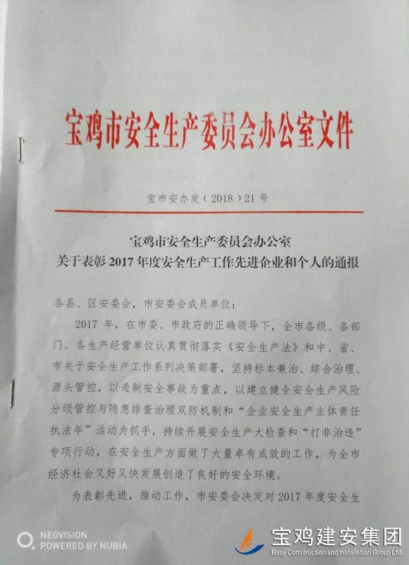近期,寶雞市安委會對2017年度安全生產先進單位進行了通報,我單位在考核中以優(yōu)異的成績獲得了此項殊榮。當然,取得這樣的成績,離不開各級領導的正確決策和基層單位的艱辛付出,公司安委會在此表示感謝。 2017年,公司始終圍繞在國家的大政方針框架下,積極展開以《安全生產法》及相關規(guī)范標準為核心的安全工作,堅持標本兼治、綜合治理、源頭管控,以遏制安全事故為重點,建立健全安全生產風險分級管控與隱患排查治理雙重機制,持續(xù)開展安全生產專項檢查,杜絕了惡性事故的發(fā)生。在安全生產標準化建設中,公司始終以“科技創(chuàng)新、合理投入、擇善而從”為出發(fā)點進行部署管理,通過系統管理及一系列舉措,使公司安全管理走在本土行業(yè)前列,且在多次檢查驗收中,獲得省、市級領導的點贊。 九牛一毫莫自夸 驕傲自滿必翻車,成績只代表過去,2018年,我們要完善不足,戒驕戒躁,砥礪前行。 寶雞建安集團股份有限公司安委會 2018年4月25日