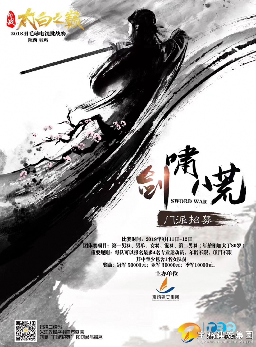 凡有井水處皆聞江湖聲古有華山論劍今有約戰(zhàn)太白2018羽林風(fēng)起云涌各路豪杰逐鹿中原值此日新月異之際先鋒乒羽發(fā)出江湖招募令:誠邀江湖各大門派羽林豪杰金秋八月齊聚雍城共襄羽林盛舉! 太白之顛 羽林盟主之位等你來戰(zhàn)!