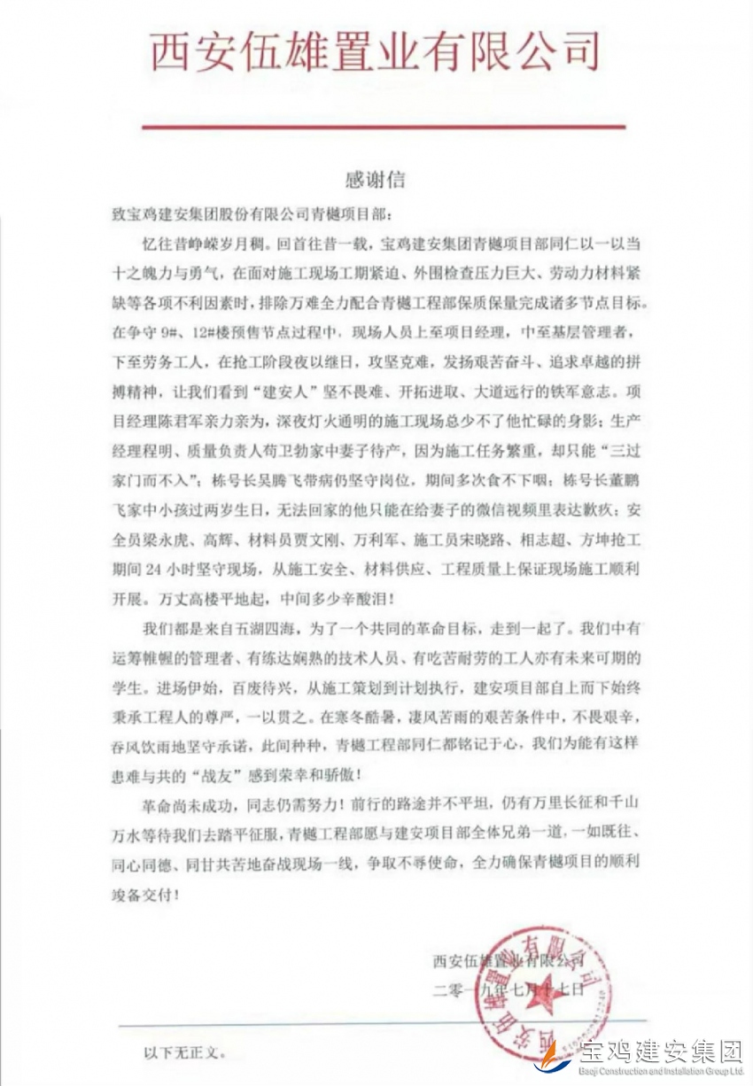 2019年7月17日,我公司路橋項目部承建的中南青樾項目收到由建設單位西安伍雄置業(yè)有限公司發(fā)出的一封感謝信,信中言辭懇切,對路橋公司青樾項目管理人員給出了極高的評價。在面對施工現場工期緊迫、資金短缺、外圍檢查壓力巨大、勞動力材料緊缺等各項不利因素時,寶雞建安集團青樾項目部各位同仁克服自身困難、艱苦奮斗、不畏艱難以一當十之魄力與勇氣保質保量并按工期節(jié)點完成了施工任務。