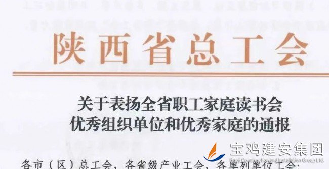 另?yè)?jù)消息,在第28個(gè)“世界讀書(shū)日”到來(lái)之際,由市總工會(huì)推薦的全市職工讀書(shū)活動(dòng)兩個(gè)代表家庭,被陜西省總工會(huì)授予全省優(yōu)秀單位稱號(hào),寶雞建安集團(tuán)工會(huì)成為代表全市職工讀書(shū)活動(dòng)中的典型表率之一,受到全省通報(bào)嘉獎(jiǎng),為寶雞贏得了榮譽(yù)。